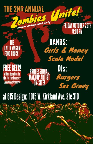 Tomorrow night there will be an epic Halloween party, and you’re invited! Yes, Erica of 615 Design has opened her awesome theatrical set design studio for the second year in row to host theĀ Zombie Unite! Undead UndergroundĀ party! This year the party’s entertainment features my band Scale Model, Girls & Money, and DJs Burgers and Sex Gravy. We also have the Latin Wagon food truck, FREE BEER (with a donation to Hike for the Homeless Team Hotsteppers), and a professional zombie makeup artist onsite! Trust me- this is the coolest space you can imagine for a Halloween party, complete with a huge creepy-ass fake tree from one of Erica’s past set designs. Did I mention it’s totally FREE to get in? Yeah, it’s free. Here’s the full rundown: