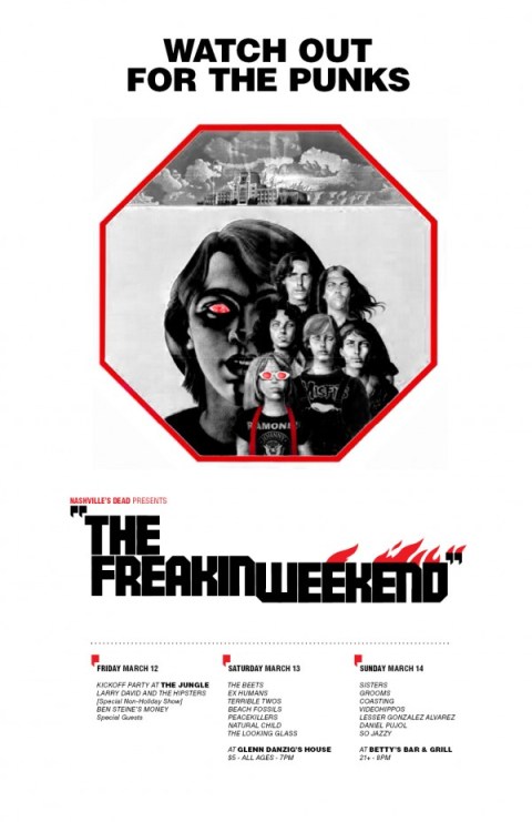 For the third year in a row, local music blog Nashville’s Dead is hosting their Freakin’ Weekend festival. It all kicks off tonight at The End with a special all-ages show featuring Screaming Females, Titus Andronicus, Diarrhea Planet, and No Regrets Coyote. Thursday night things jump across the street to Exit/In for The Greenhornes, PUJOL, Ranch Ghost, Denny & The Jets, and Dirty Dreams. Friday night’s show stays at Exit/In for Jeff the Brotherhood, Cy Barkley & the Way Outsiders, D. Watusi, Useless Eaters, and Fox Fun. Then we jump back across Elliston Place to The End for the finale on Saturday: Traditional Fools, Mikal Cronin, The Men, Heavy Cream, and Cannomen.