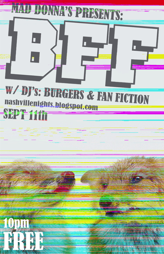 I’m proud to announce a new indie/electro dance night in east Nashville. It’s called “BFF” and features DJ’s Burgers (me) and Fan Fiction (aka Joseph Howard who runs the awesome NashvilleNights blog). It’s gonna be at Mad Donna’s (1313 Woodland St.) on Friday Sept. 11th. There’s NO COVER and it’s 18+. East Nashville hasn’t had any dance nights of this genre to my knowledge, so FF and I put our heads together to create our own. We want to make it a monthly or maybe bi-weekly gig, but this is the first one so we’ll see how it goes. Please do come check it out. All the credit for the catchy name and flyer design goes to Joseph. We’re gonna dance to bloghouse like it’s 2k7, y’all…