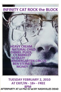 Unfortunately there’s a great show that I’m going to miss out on due to LOST tonight, and that is the Infinity Cat Rock the Block at Exit/In. In case you’ve been under a rock the past couple of months, Ryan Bruce has revived Exit/In’s free tuesday night weekly series Rock the Block. It’s similar to the 8 off 8th series at Mercy Lounge in that it’s hosted by a rotating cast of local musicians/scenemakers/bloggers/radio show hosts/etc…. It differs in that the number of bands is entirely up to the host, however most of the ones so far have been in the 7-9 band range. Tonight’s is hosted by Infinity Cat records and has a killer lineup. So if you’re not going to be glued to ABC for 3 hours, Exit/In should be your destination, because it’s free.